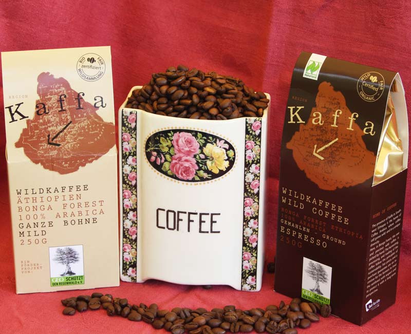 Dank eines Projektes von "GEO schützt den Regenwald ev." wächst noch heute im Schatten der großen Urwaldbäume der Wald Kaffee - in einzigartiger Vielfalt und unvergleichlicher Qualität. In der äthiopischen Provinz Kaffa/Bonga Forest, der Urheimat des Kaffees, gedeihen noch die wilden Arabica Bohnen, werden in mühevoller Handarbeit aufwendig gepflückt und zu einem der besten Kaffees der Welt verarbeitet. Durch gerechte Entlohnung entsteht ein Anreiz für die Befölkerung den Wald so zu erhalten und somit vor Abholzung zu schützen. Das einzigartige Aroma und die besondere Qualität ergibt sich daraus, dass es in den verschiedenen Waldgebieten mehr als 300 Wildsorten von Kaffeepflanzen gedeihen, jede mit eigenem Charakter, manche schmecken fruchtig, andere kräftig-herb, wieder andere leicht und blumig. Um den einzigartigen Charakter der verwendeten Lagen optimal hervorzuheben, wird er nach traditionellem Trommelröstverfahren in kleinen Chargen langsam und schonend bei ca. 200°C geröstet. - bio und fair gehandelt.
