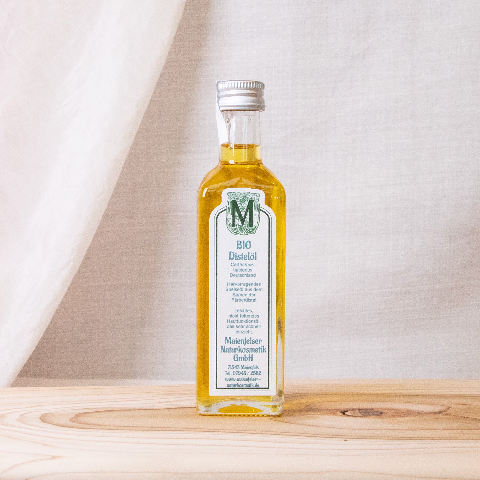 Distelöl wird aus den Samen der altbekannten Färberdistel gepresst. Früher hauptsächlich als Färberpflanze eingesetzt (Saflorrot / Carthamin), wird sie heute vorwiegend zur Ölgewinnung angebaut. Das gelbe Öl hat einige Besonderheiten aufzubieten, welches nur in Distelöl vorkommt.
