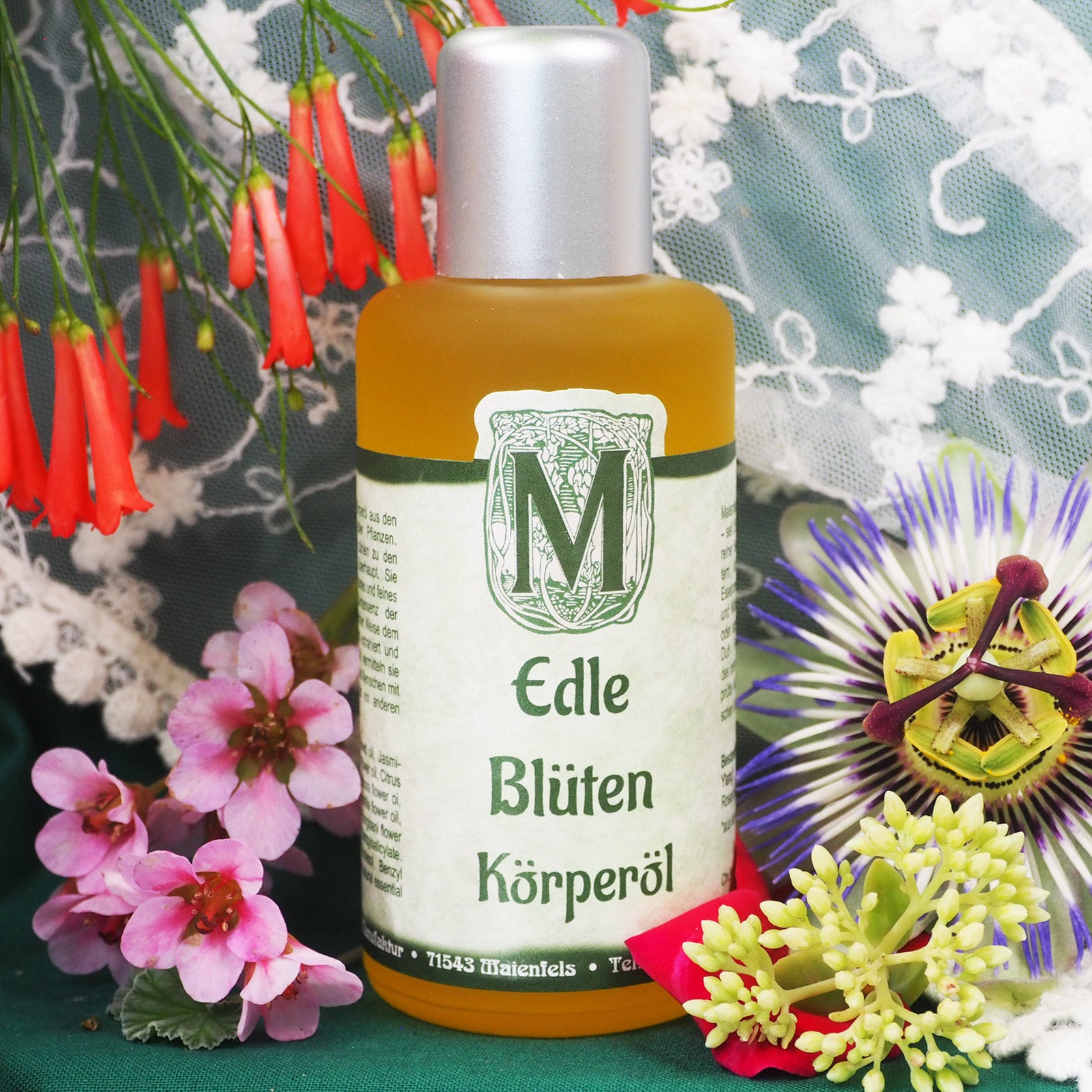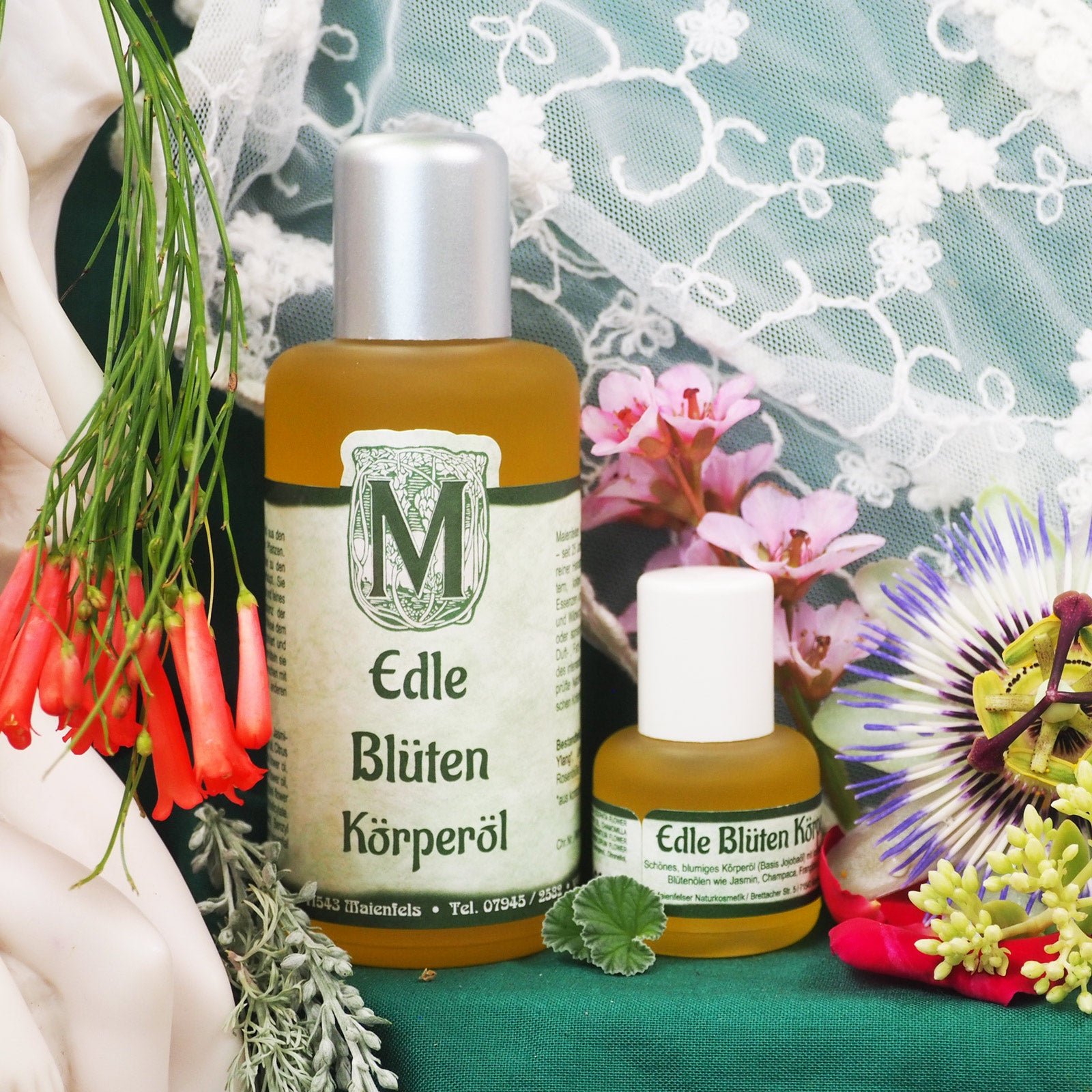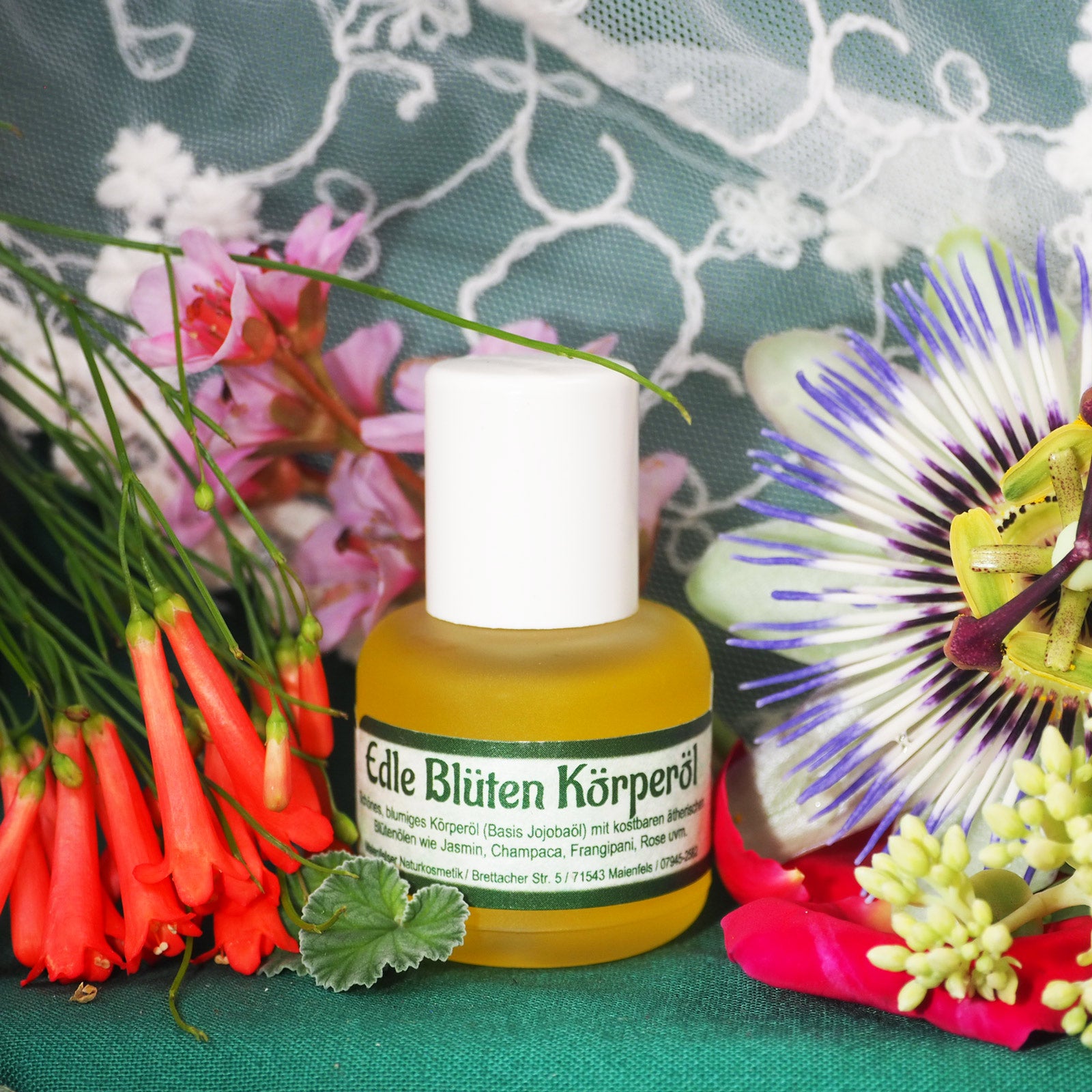 Schönes, blumiges Körperöl aus kostbaren Blüten von edlen Pflanzen. Ätherische Blütenöle zählen zu den teuersten Extrakten überhaupt. Sie übermitteln durch ihr zartes und feines Blütenaroma die Quintessenz der Natur in unnachahmbarer Weise dem Menschen. Schonend destilliert und gebunden in Jojobaöl, schenken sie ein Gefühl der Lebensfreude und Symbiose des Menschen mit der Natur. Rein und natürlich, ohne Zusatz von anderen Pflanzenölen oder synthetische Parfümbillig-Imitationen. Dominierend ist die Jasminblüte im Verbund mit der indischen Magnolie (Champaca). Unterstützt von der Tuberose (Nachthyazinthe) und der Frangipaniblüte vereinigen sich die Blüten des Ylangbaumes und der feinen Orangenblüte. Natürlich fehlen weder die Rose noch der Lavendel, auch die Kamille beteiligt sich am bunten Blütenreigen.