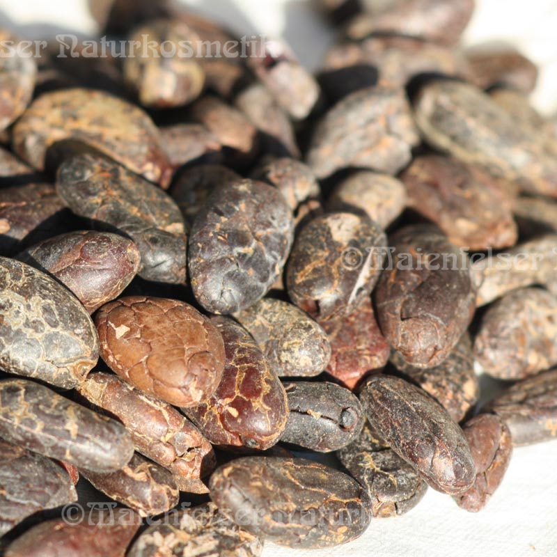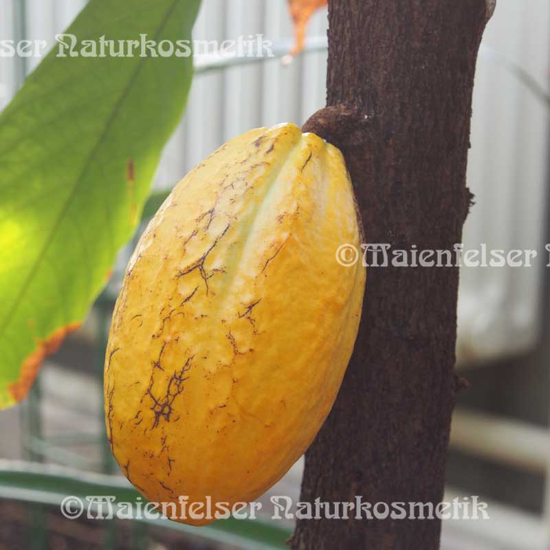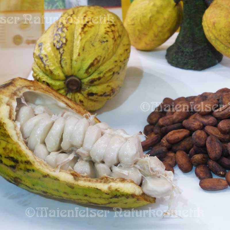 Die Kakaobutter ist das Fett, das durch Zentrifugieren oder Abpressen aus den gerösteten Kakaokernen gewonnen wird. Sie ist, wie der Name Butter ausdrückt, von fester butterartiger Konsistenz, die oberhalb von 35° C bei Hautwärme schmilzt. Kakaobutter ist ein teures Fett, der Bedarf in der Süßwarenindustrie (Schokolade), in der Pharmazie (Pastillen) und in der Kosmetik (Cremes und Seifen) ist enorm, was sich letztendlich im Preis ausdrückt. Minderwertige Ware, d.h. schlechte, schimmelige Nüsse von Kakaobohnen, die in der Lebensmittelindustrie keine Verwendung mehr finden, werden oftmals von Kosmetikkonzernen aufgekauft, um sie geschönt und billigst in der konventionellen Kosmetik einzusetzen.