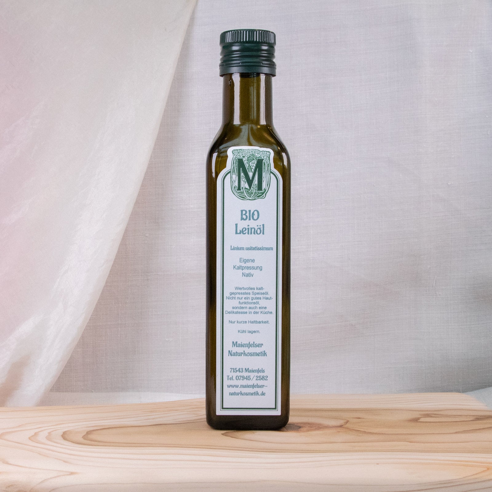 Kosmetische Verwendung: Durch die kurze Haltbarkeit scheut sich jeder Hersteller davor, Leinöl als Rohstoff mit in die Kosmetik einzuarbeiten. Jedoch gilt  Leinöl  als  gutes  Hautfunktionsöl,  wenn  es  frisch  ist.  Durch  den  hohen Alpha-Linolengehalt hat es einen zellregenerierenden Effekt und ist hervorragend bei trockener und empfindlicher Haut geeignet.