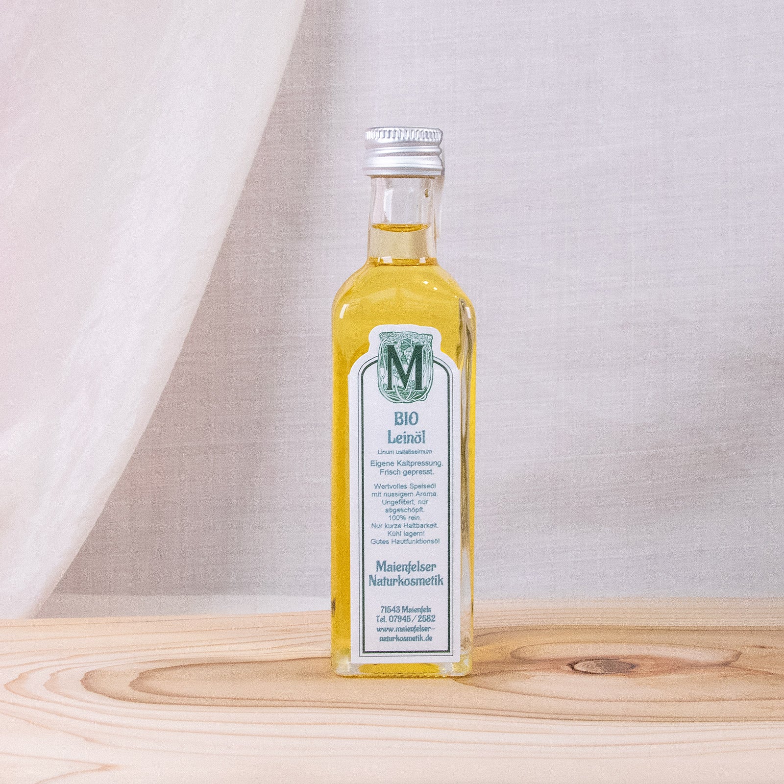 Leinöl zählt zu den wertvollsten kaltgepressten Pflanzenölen durch den sehr hohen Gehalt der wertvollen Alpha-Linolensäure. Leider zählt Leinsamenöl zu den schnell verderblichen Ölen. Schon nach wenigen Wochen bildet sich eine Bitternote, die dann stetig zunimmt und nach 8–10 Wochen das Öl nicht mehr genießbar macht. Entgegen aller Meinungen aus der Literatur schmeckt frisch gepresstes Leinsamenöl angenehm mild, nussig mit einer feinen aromatischen Note und kann als ausgesprochen wohlschmeckend eingeordnet werden. Leinöl kann man eigentlich nur direkt beim Ölmüller kaufen, eben wegen seiner kurzen Haltbarkeit. Von mir getestetes Leinöl in Reformhäusern, Bioläden oder Supermärkten ist entweder ungenießbar durch die extreme Bitternote oder schmeckt neutral nach gar nichts und ist dann raffiniert, was den hohen Gesundheitsgehalt des Leinöls vermindert. Wir pressen 1 - 2 Mal  im  Monat  frisches  Leinsamenöl -  Saatgut  aus  biologischem  Anbau. - von der goldenen Sorte, die qualitativ etwas höher liegt als der braune Lein. Bewahren Sie Ihr Leinöl kühl und dunkel auf, das erhöht die Stabilität um ein paar Tage. Aber! Altes Leinöl wird für die Holzbehandlung immer besser, je älter es ist, zur Imprägnierung von Holzmöbeln oder Holzfassaden im Außenbereich. Es bildet einen rissfreien Schutz vor Witterungseinflüssen oder im Wohnbereich als giftfreie Lasierung z. B. im Kinderzimmer. Vorsicht: Leinöllappen oder Pinsel können sich selbst entzünden. Nach Gebrauch in einem luftdichten Glas aufbewahren oder mit Seife auswaschen.