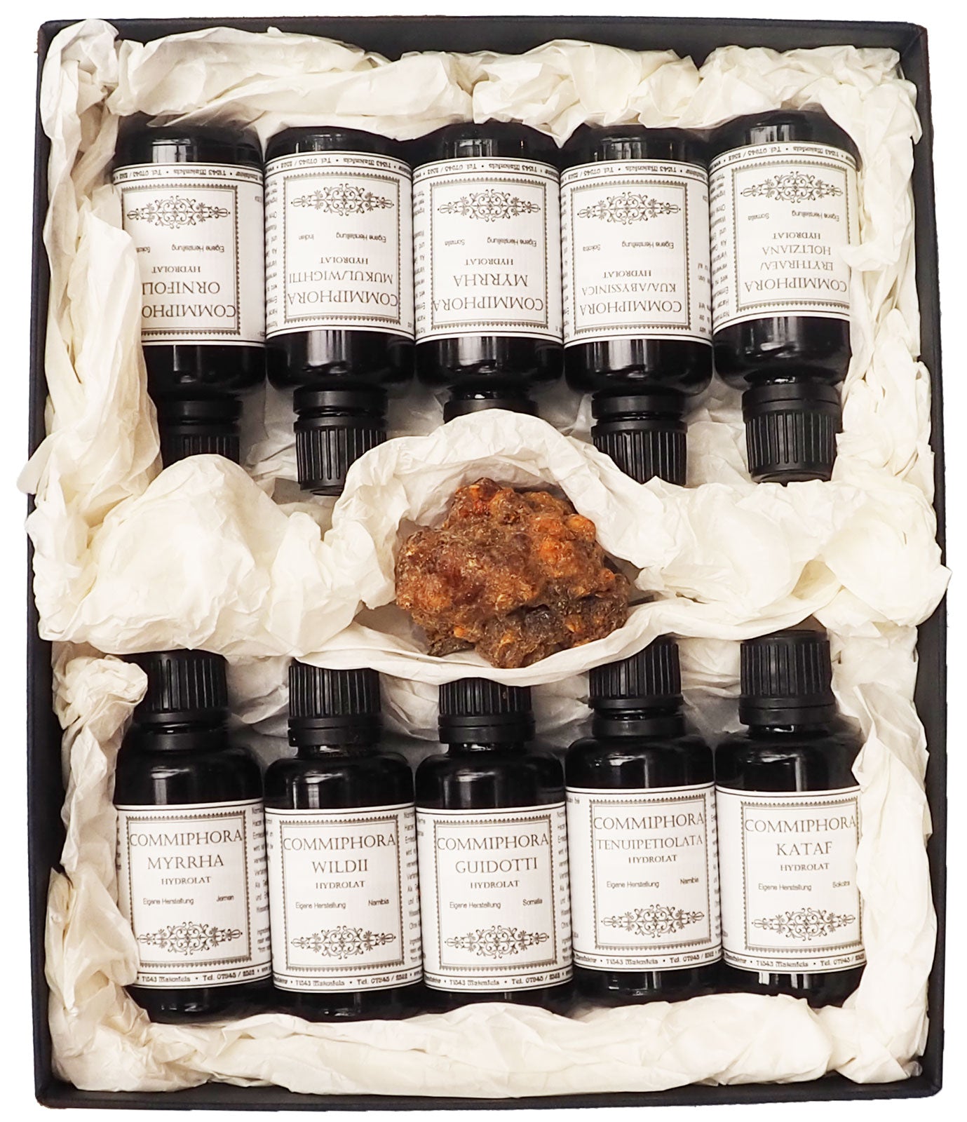 10 verschiedene Myrrhe-Hydrolate in 30 ml Violettglasflaschen, traditionell in der Kupferdestille mit einem selbst entwickelten aufwändigen Verfahren hergestellt. Einige Sorten sind sehr schwer zu bekommen, teuer und da wir nur geringe Mengen destilliert haben und alles noch durch echte Handarbeit produziert wird, ergibt sich ein etwas höhere aber definitiv  fairer Preis. Zudem sein noch zu erwähne, dass wir nur die höchste Qualität destillieren (die großen schönen Harzbrocken) um das bestmögliche Ergebnis zu erzielen.