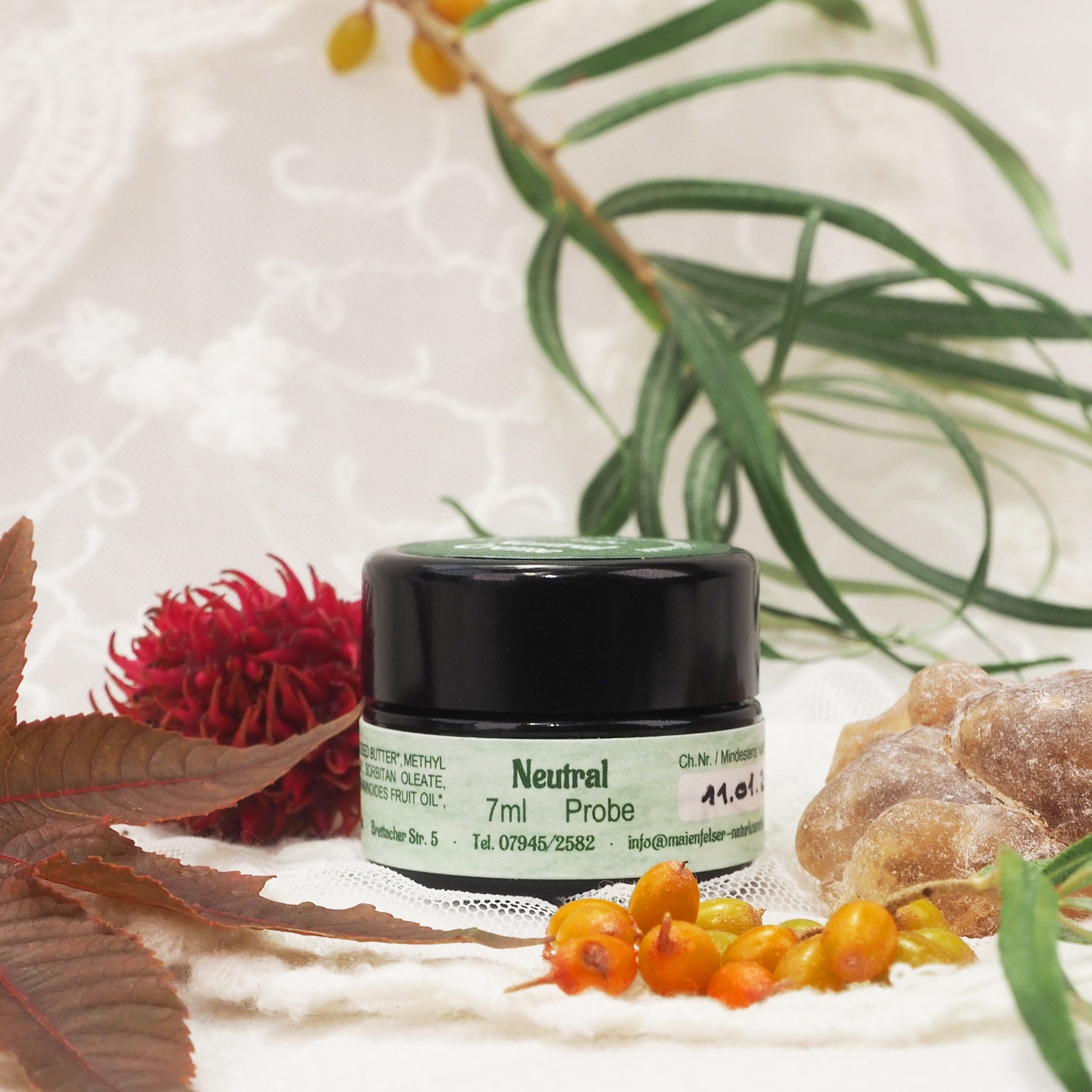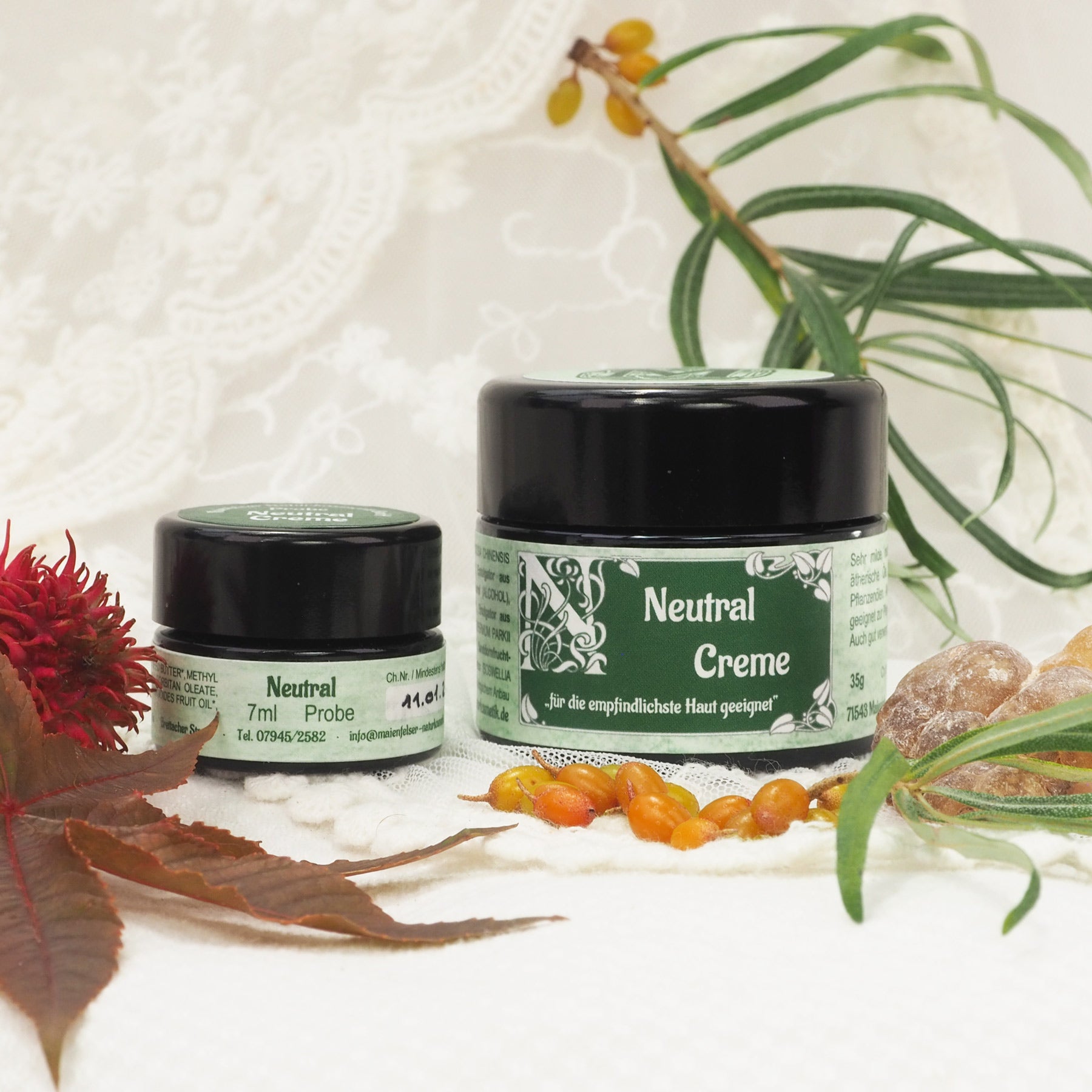Eine Feuchtigkeitscreme der besonderen Art ist unsere Neutral Creme. Neutral das heißt ohne Kräuterzusätze, ohne ätherische Öle, ohne zusätzlichen Duft. Sie ist gedacht für Personen die auch in der Naturkosmetik Schwierigkeiten haben, eine für sie verträgliche Creme zu finden. Sie eignet sich gut für das Untermischen eines bevorzugten ätherischen Öls oder von Bachblüten. Als Basis dienen hochwertigste Pflanzenöle und Quellwasser. Die Farbe ergibt sich nur durch das Sanddornöl. Ein geringer Anteil von Weihrauch und unser Grapefruitkernextrakt sorgen für eine gute Stabilisierung. Sehr gut verträglich. Die gleiche Zusammensetzung gibt es auch bei der Neutral-Lotion zur allergiearmen Pflege für den Körper. (Siehe unter Lotionen)