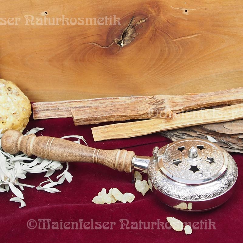 Eignet sich sehr gut zur Hausräucherung, da man die Räucherpfanne einfach am Griff fassen und mit der Räucherung durchs Haus gehen kann. Falls Sie die Räucherpfanne abstellen möchten, bietet sich hier eine schöne, polierte Baumscheibe (mit Jahresringen) aus besonderen heimischen Hölzern an, auf der Sie ohne Gefahr auch eine Standräucherung durchführen lässt. Bitte stellen Sie das heiße Räucherpfännchen immer auf das Holzbrettchen oder auf eine feuerfeste Unterlage.