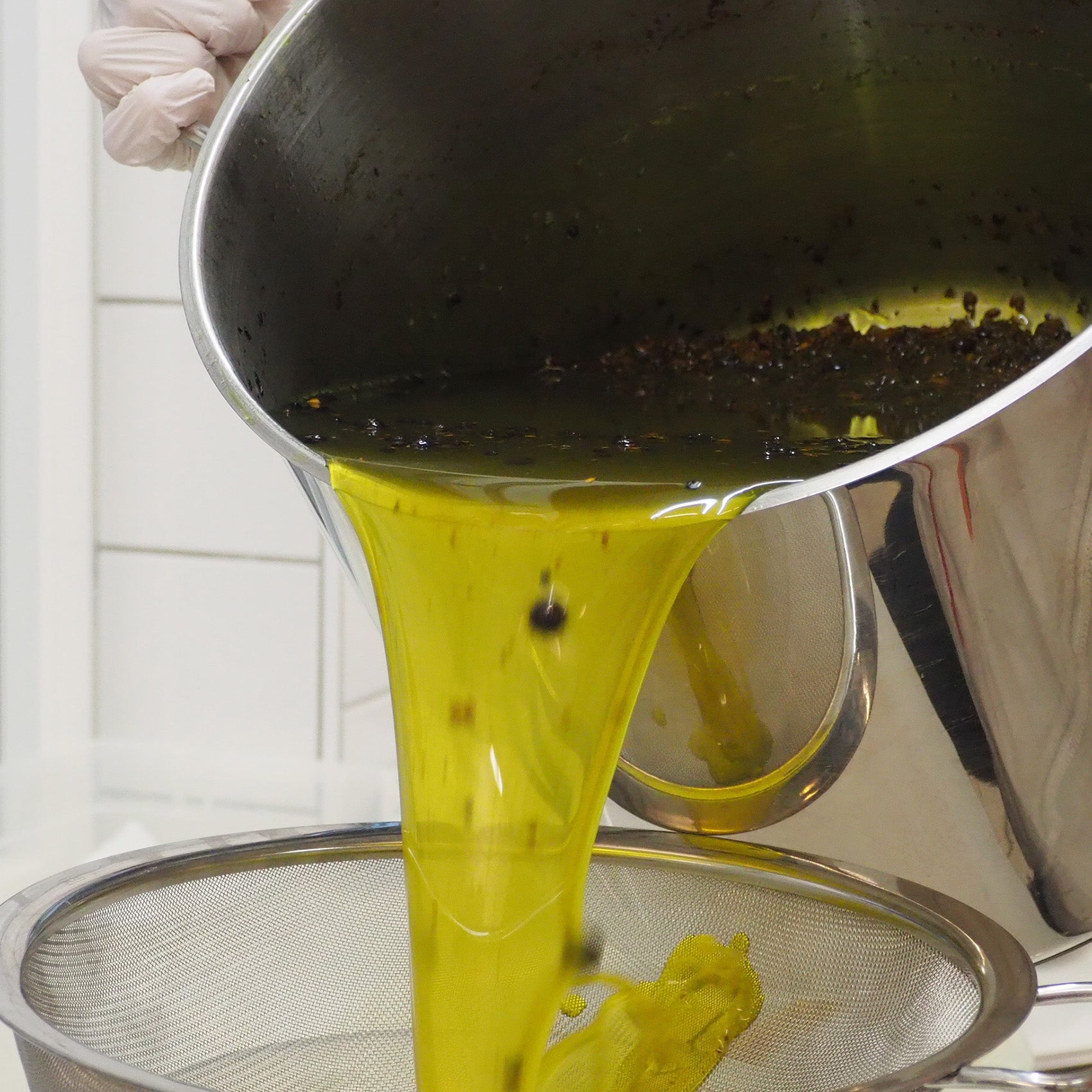 Die Kräuter zu jedem einzelnen Chakra-Öl werden in Wasser angesetzt und ausgezogen. Dieser Sud mit den Kräutern wird mit Sesamöl unter ständigem Rühren eingeköchelt, bis sich die Kräuter in das Öl mazeriert haben. Dies kann viele Stunden und Tage dauern und ergibt ein konzentriertes und hoch aromatisches Chakra-Öl. Unterstützt wird dies noch mit Zugabe der jeweiligen ätherischen Öle.