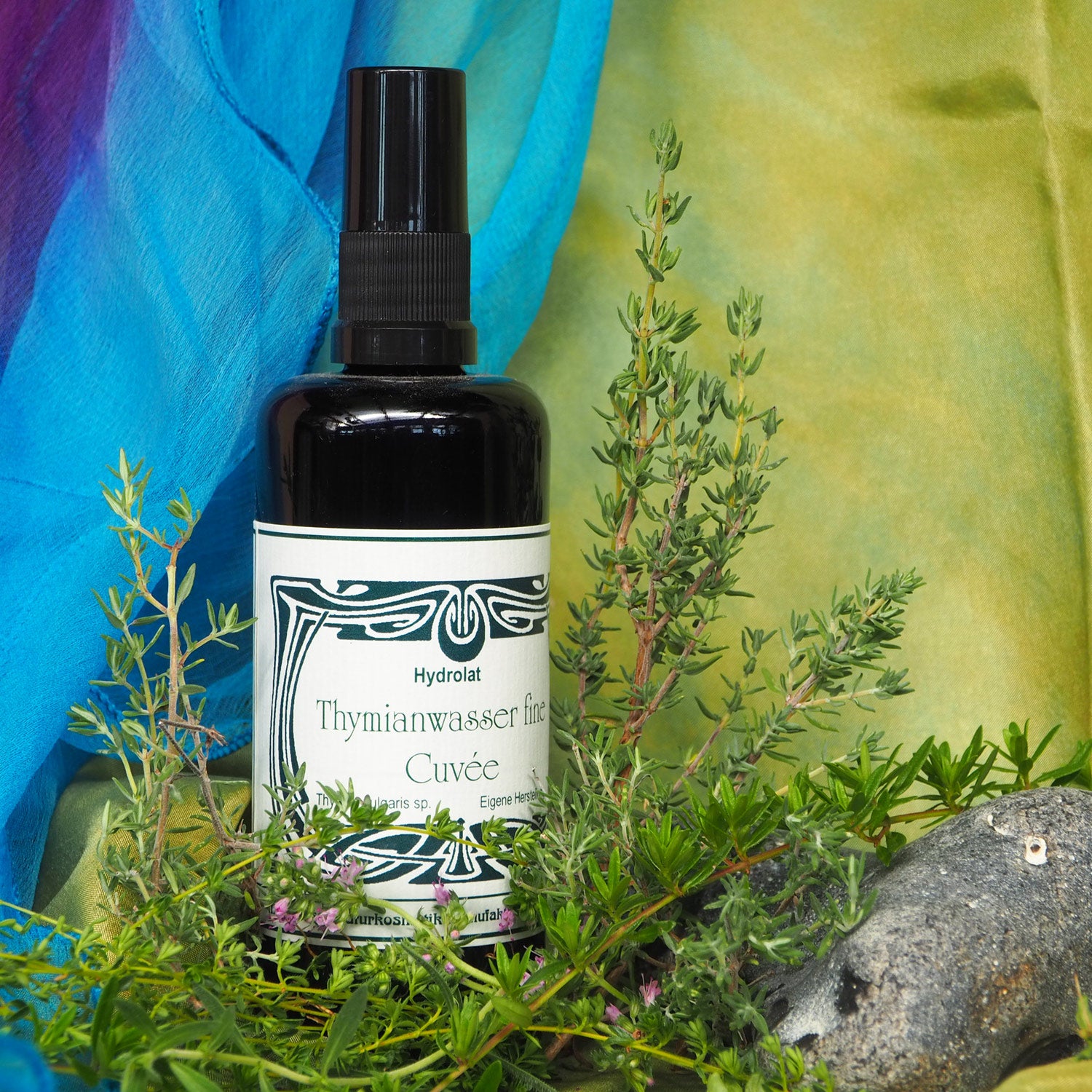 Dieses Thymianhydrolat besteht aus vielen verschiedenen Thymiansorten. Dominierend ist der kleine, hoch aromatische wilde Thymian aus der Provence und verschiedene andere Thymianarten aus unserem Bergkräutergarten. Als Duftwasser und Raumparfüm zeigt es seine große Wirkung und 'last but not least' liebe ich persönlich den typisch würzigen Thymianduft sehr.